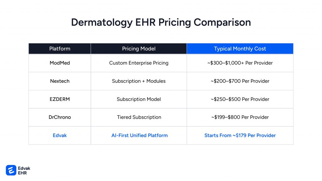 Modern AI-first platforms offer lower entry pricing. Edvak offers dermatology EHR capabilities starting from $179 per provider, while including features such as AI-Powered Documentation, AI-Assisted Coding, Inventory Management and Two-Way Scheduling within the platform.