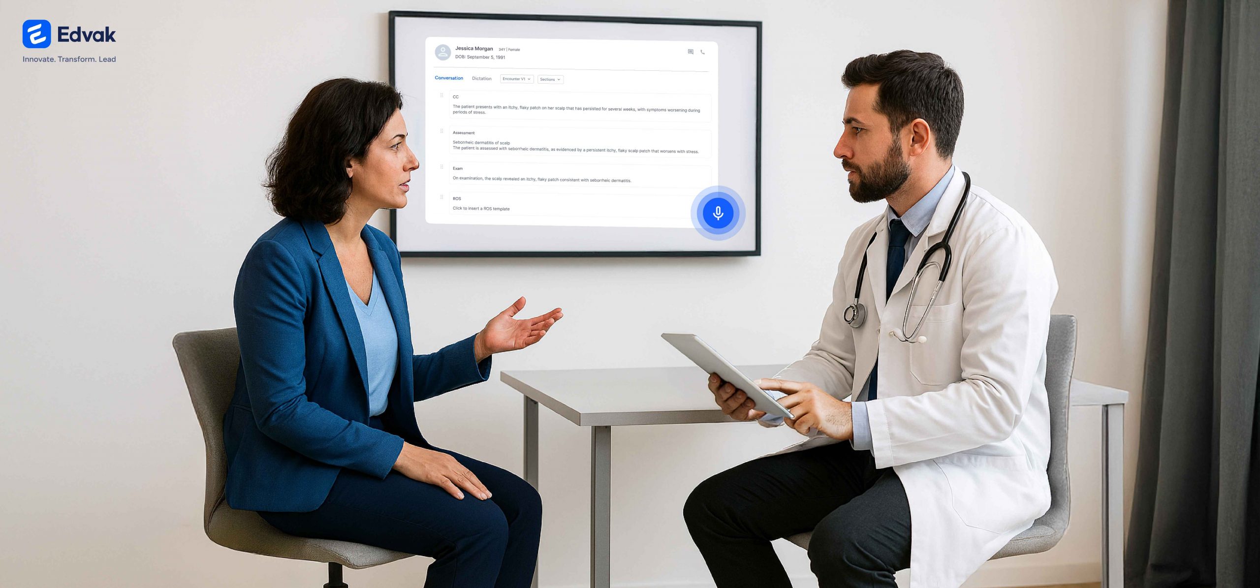 Voice-to-clinical-notes technology solves this problem by converting natural conversation into structured documentation while you examine patients. Edvak’s conversation-to-notes platform listens as you speak, organizing your words into complete SOAP notes that are ready to review and sign before the patient leaves the exam room.